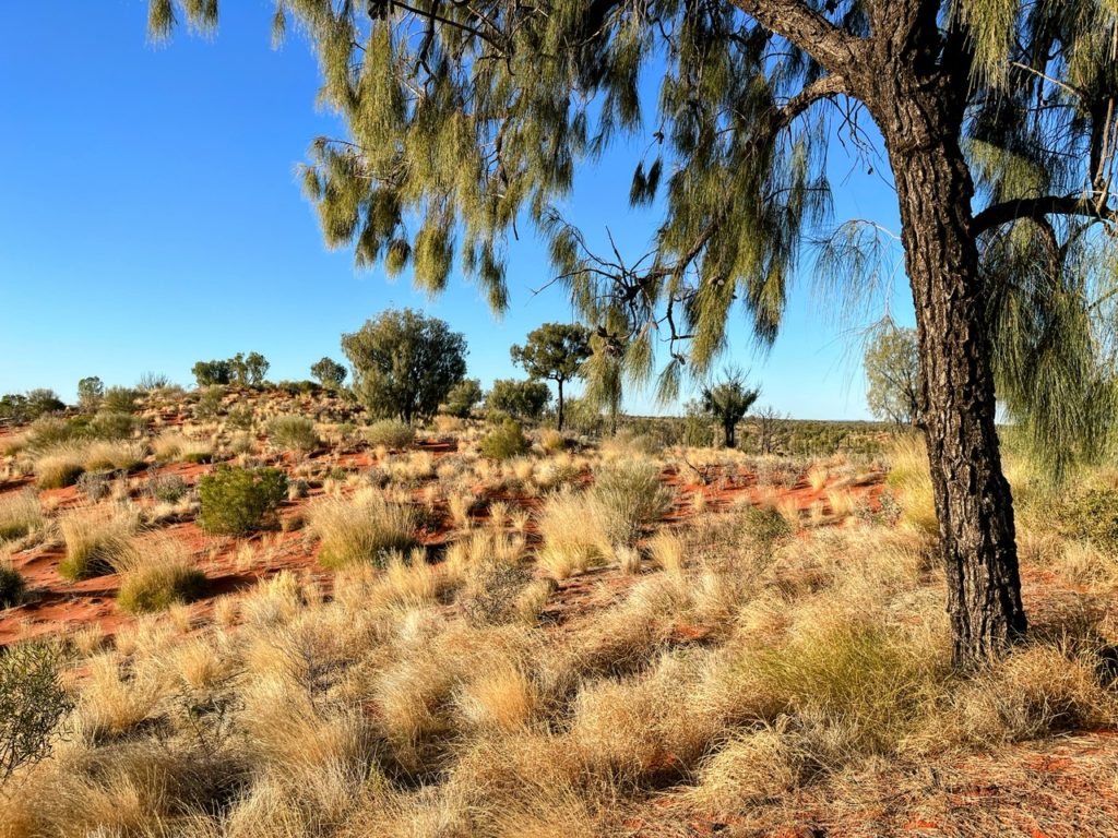 I noticed the scenery was changing again. Grassy yellow spinifex began to appear along with the strange looking Desert Oak which grows tight and narrow whilst young before spreading its branches into maturity.